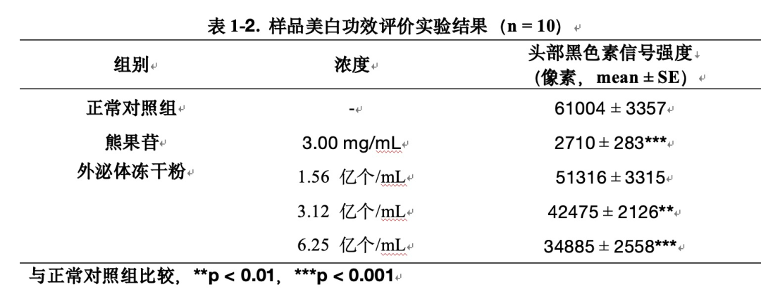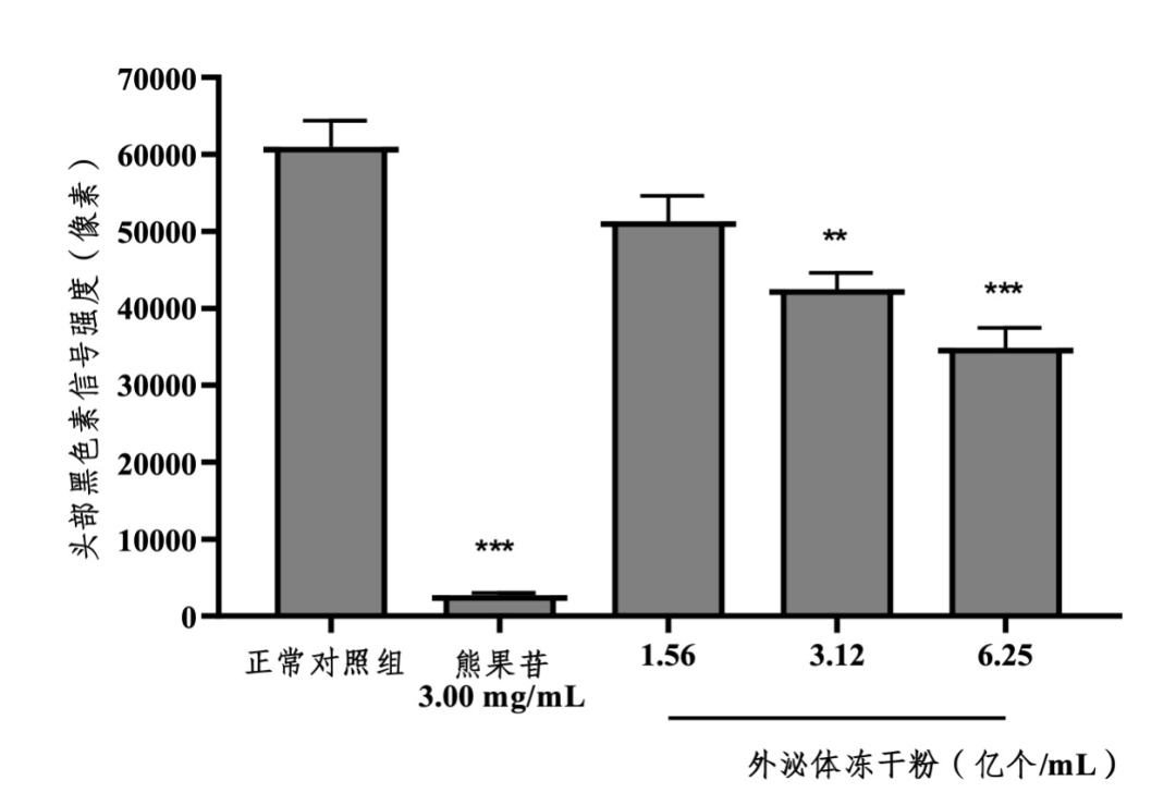 在本实验条件下,由沈阳盛京生物细胞研发中心有限公司提供的外泌体冻干粉具有美白功效,具体表现为减少头部黑色素信号强度。