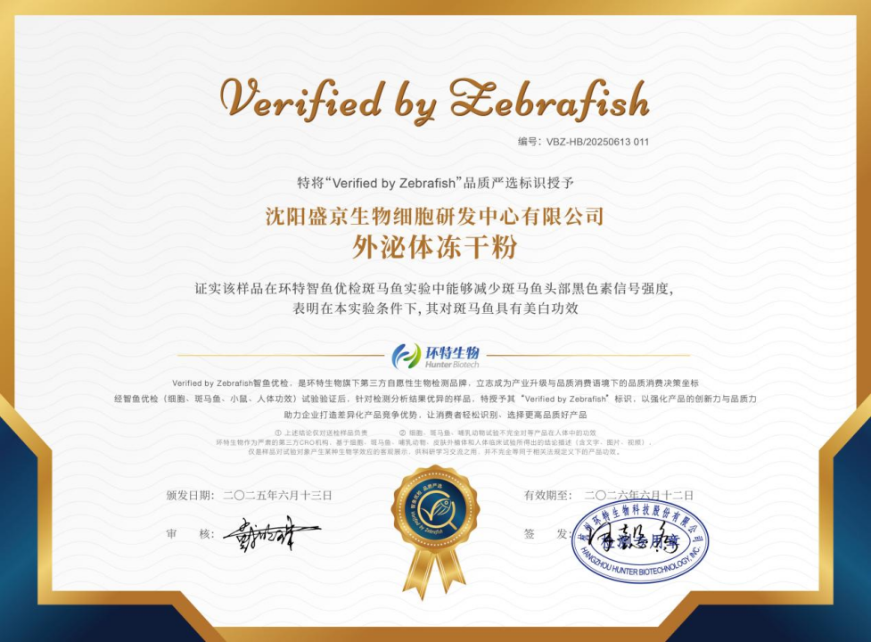 沈阳盛京生物细胞研发中心有限公司核心产品——脐带间充质外泌体冻干粉原料,正式通过环特生物 [智鱼优检] 功效评价体系权威认证。实验证实:该原料在标准化斑马鱼模型中显著降低头部黑色素信号强度,表明白美功效明确,荣获 “Veritied by Zebrafish” 标识认证。此项突破为皮肤机制研究提供了高活性、可溯源的标准化工具原料。